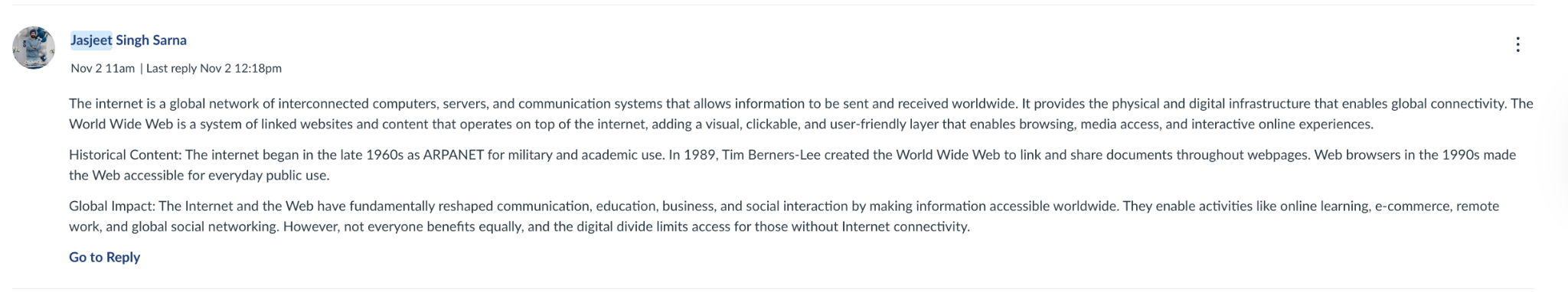 This discussion helped me understand how the two concepts connect but serve very different purposes. The internet acts as the global infrastructure that moves data around the world, while the Web builds on top of it to create the user-friendly experience we rely on every day. Looking back at their history also showed me how quickly technology evolved—from ARPANET to modern online communication—and how these developments changed the way we learn, work, and interact. This discussion also made me more aware of the digital divide and how unequal access to technology affects opportunities for many people around the world.