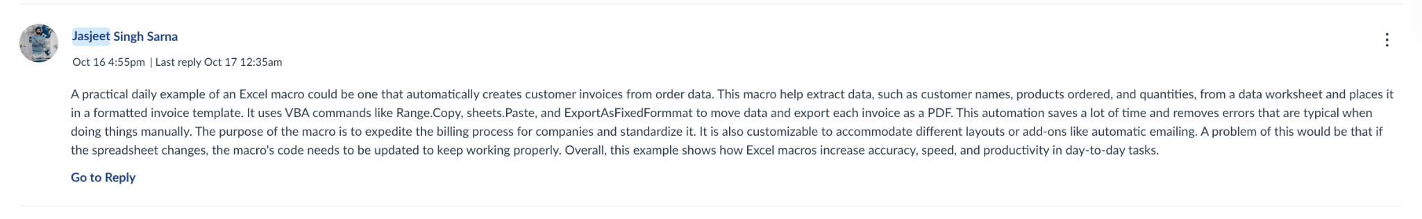 In this assignment, I learned how powerful automation can be for improving everyday business tasks. Breaking down the example of generating invoices showed me how macros save time, reduce mistakes, and keep workflows consistent across a company. It also helped me understand how tools like VBA give users the ability to customize spreadsheets for specific needs, which makes Excel much more than a simple data program. Overall, this discussion reminded me how important automation is in improving efficiency and accuracy in professional environments.