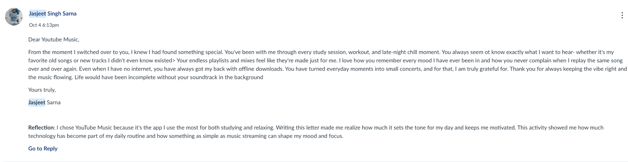 For this activity, I wrote a playful letter to YouTube Music, which made me recognize how much I rely on it throughout my daily routine. Thinking through my relationship with the app helped me see how technology can shape mood, motivation, and productivity in ways we don’t always notice. It also made me reflect on how personalized recommendations and offline access have become small but meaningful parts of my everyday life. Overall, this assignment helped me appreciate how even simple apps can influence how we study, relax, and stay focused.